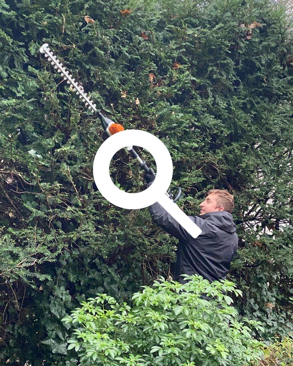 12 meter heg gesnoeid inclusief lastig snoeibare duindoorn, strook wildgroeiende ellende weggemaaid, Als extraatje heeft hij ook nog onkruid van terras en oprit mooi weggehaald.